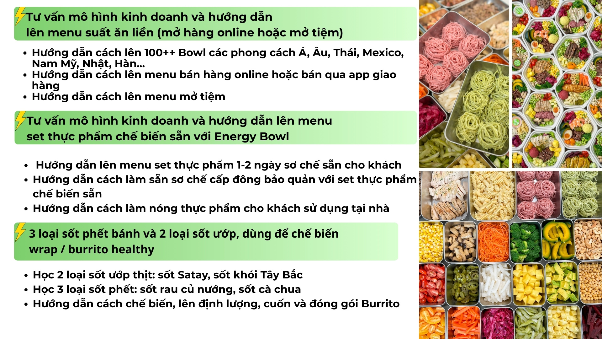 Trong lớp học, Energy Bowl được ứng dụng linh hoạt vào hai hướng kinh doanh phổ biến là bộ nguyên liệu nấu nhanh tại nhà Ready to cook với thực phẩm được sơ chế và đóng gói gọn gàng và suất ăn làm sẵn Ready to eat. Khoá học dạy học viên kỹ thuật nấu chậm giúp thịt mềm mọng, món ăn giữ vị ổn định, khách chỉ cần vài phút hoàn thiện là dùng được, rất phù hợp bán online tại nhà, vận hành số lượng lớn, và phục vụ nhóm khách bận rộn, người muốn ăn tốt cho sức khỏe, hoặc đang tập luyện để tăng cơ giảm mỡ.