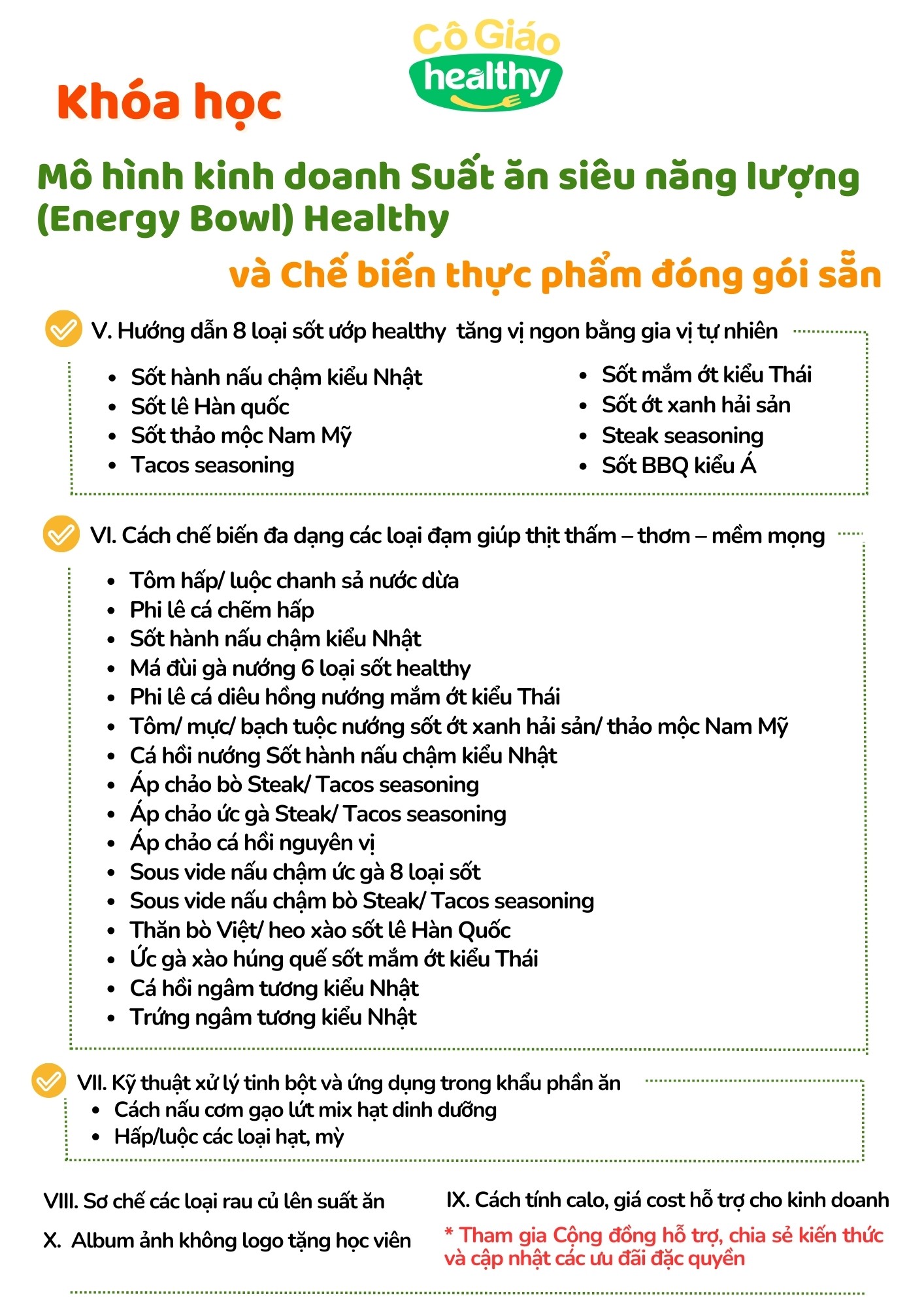 Suất ăn siêu năng lượng (Energy Bowl) là một xu hướng ăn uống lành mạnh mới trên thế giới, khác với kiểu suất eat clean truyền thống ở chỗ: thay vì mỗi ngày phải tính toán và nấu nướng rườm rà, mình dùng một “khung bữa ăn” đã được thiết kế sẵn gồm tinh bột tốt, rau, chất béo tốt, đạm và hệ sốt – để ăn đủ chất, dễ ăn, không ngán và không phải đau đầu tính lại mỗi ngày. Trong lớp học, Energy Bowl được ứng dụng linh hoạt vào hai hướng kinh doanh phổ biến là bộ nguyên liệu nấu nhanh tại nhà Ready to cook với thực phẩm được sơ chế và đóng gói gọn gàng và suất ăn làm sẵn Ready to eat. Khoá học dạy học viên kỹ thuật nấu chậm giúp thịt mềm mọng, món ăn giữ vị ổn định, khách chỉ cần vài phút hoàn thiện là dùng được, rất phù hợp bán online tại nhà, vận hành số lượng lớn, và phục vụ nhóm khách bận rộn, người muốn ăn tốt cho sức khỏe, hoặc đang tập luyện để tăng cơ giảm mỡ.