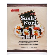 - Rong biển Godbawee là một trong những sản phẩm rong biển cuộn cơm bán chạy và được yêu thích nhất. Không chỉ có kết cấu dai giúp cuốn kimbap chắc chắn và không bị rách khi cuộn thì nó còn có nhiều công dụng thú vị khác. Khi buồn buồn mà còn dư lá rong biển không cuộn hết, bạn có thể ăn như một loại snack tiện lợi, còn buồn nữa thì cắt sợi nhỏ như rong biển vụn làm topping cho tô mì thêm hấp dẫn và đẹp mắt.